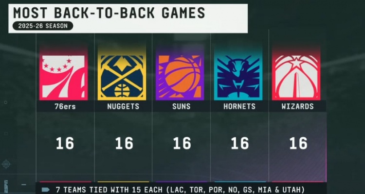 下赛季背靠背次数16次的球队:76人、掘金、太阳、黄蜂、奇才